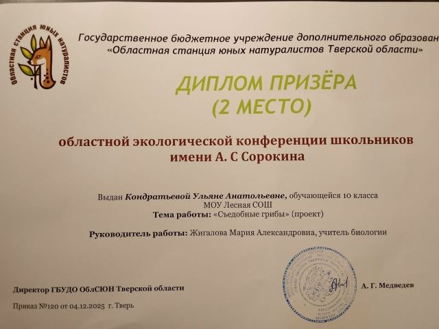 Ульяна Кондратьева заняла ПРИЗОВОЕ 2 МЕСТО с исследованием «Съедобные незнакомцы». Ульяна стала единственным участником из 14 в своей номинации, кто представил доклад полностью по памяти, без подглядывания в текст! Это невероятная демонстрация уверенности и отличного владения материалом.